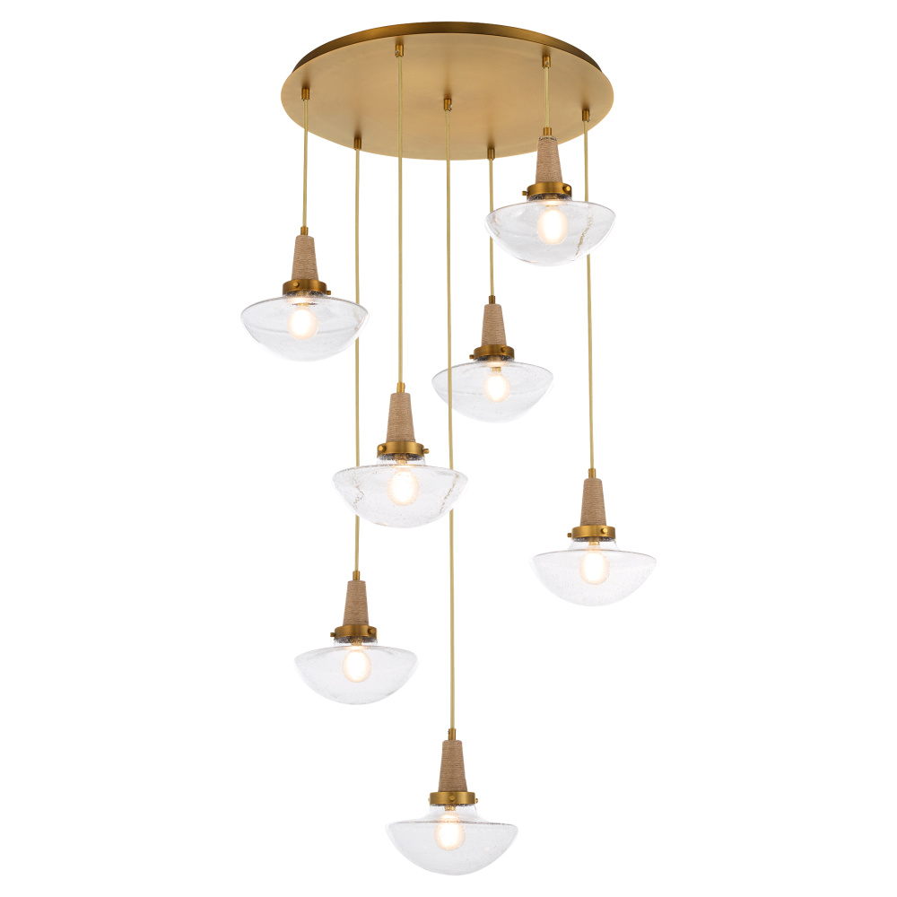 Stockport brings a contemporary casual style to multi-port pendant lighting, featuring small bowl-shaped fixtures with seeded glass and a natural fiber-wrapped crown. A fabric cord suspends each light from the canopy, adding a soft, organic touch to the design. Various light configurations are available, with a brushed brass finish accenting the metal details.