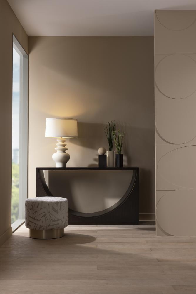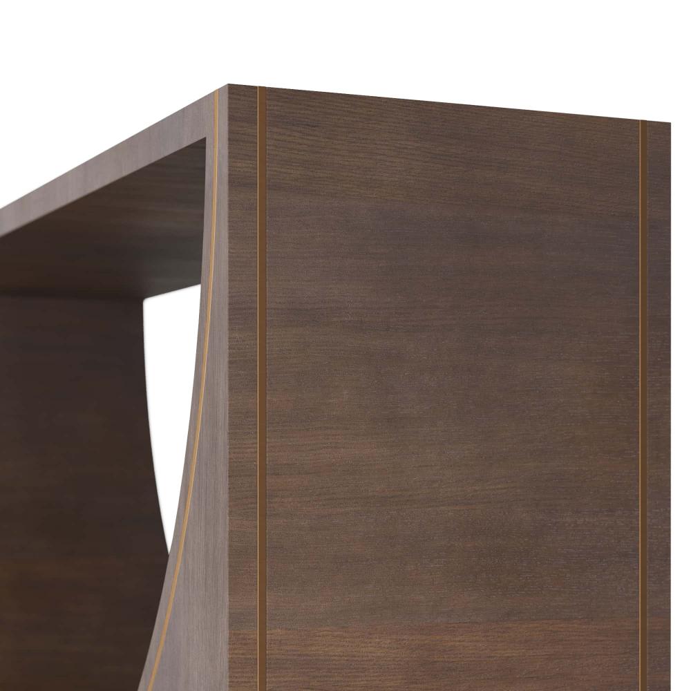 CREATED IN A DESIGN THAT PLAYS WITH POSITIVE AND NEGATIVE SPACE, OUR TATTON CONSOLE MAKES A GRAPHIC PRESENTATION. THE PIECE FEATURES AN INVERTED ARCHED UMBER OAK VENEER BASE, WITH AN ANTIQUE BRASS INLAY THAT FOLLOWS THE CURVE OF THE PEDESTAL AND RETURNS ACROSS THE TOP. THE CONSOLE RESTS ATOP AN ANTIQUE BRASS PLINTH. FINISH WILL VARY.