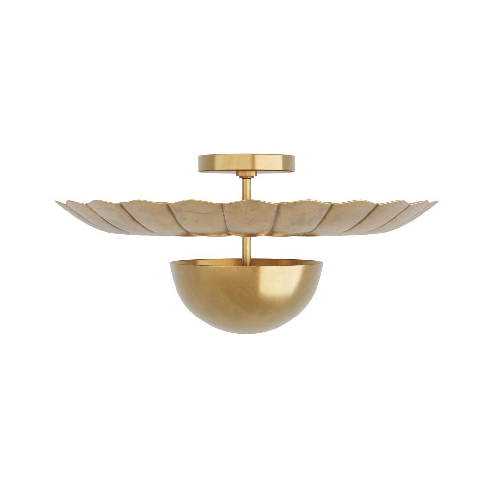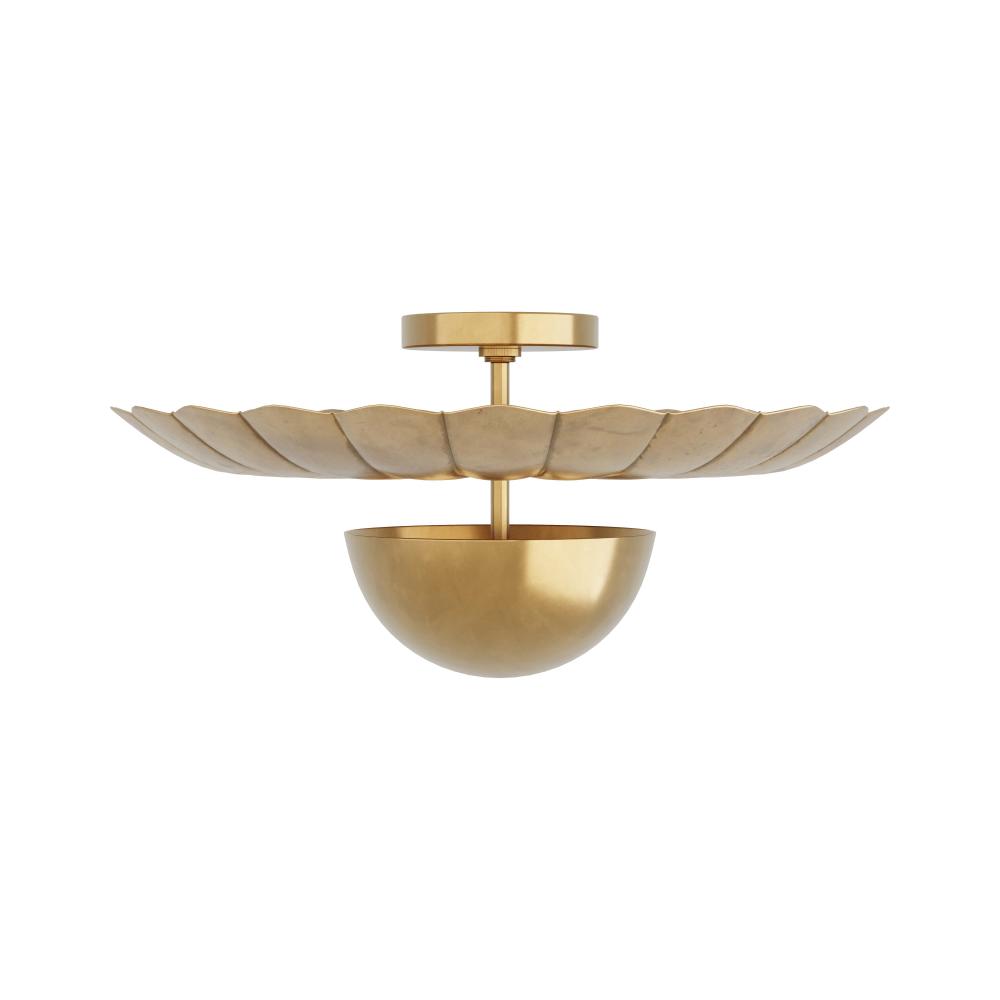 PLAYFULLY CONCEIVED TO RESEMBLE A LILY PAD, THE TERESA FLUSH MOUNT IS CAST ENTIRELY IN ANTIQUE BRASS WITH A DOMED BODY THAT EMITS LIGHT UPWARDS TO THE REFLECTOR, FORGED WITH SEAMS TO LOOK LIKE PETALS.