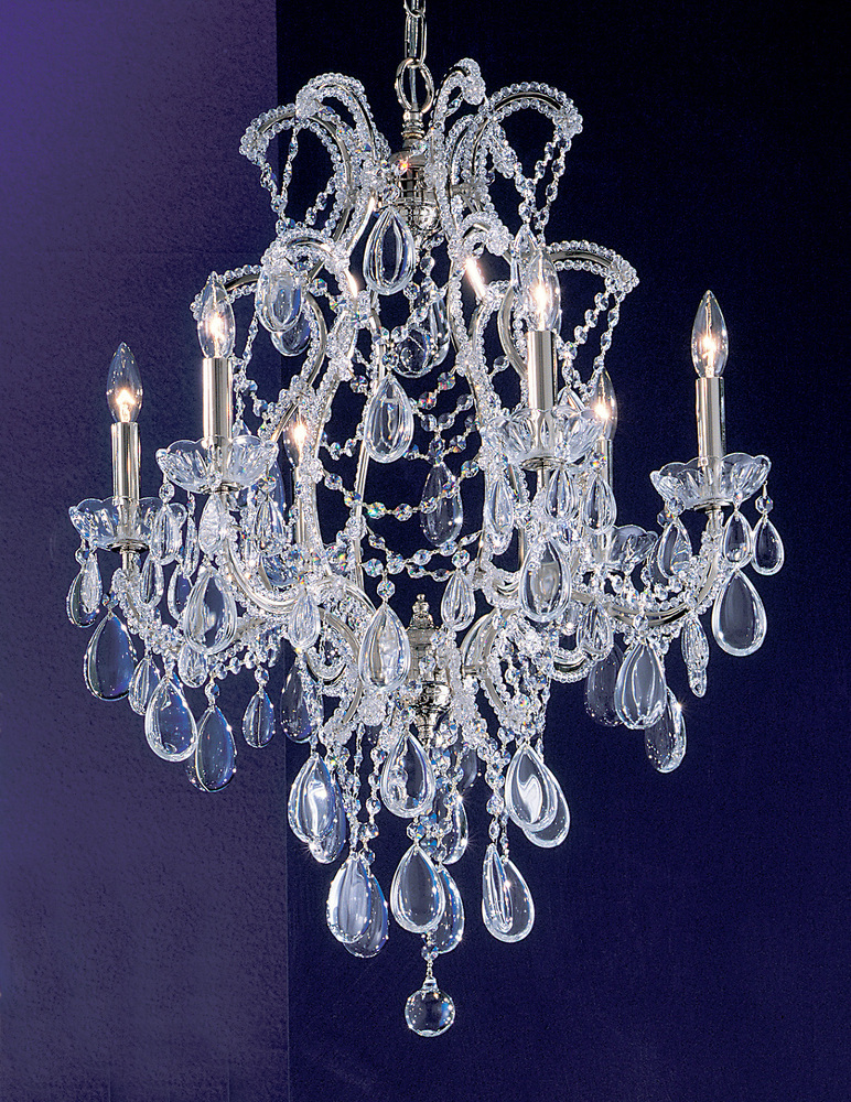 Tivoli 24"Wide x 24"Long x 29"High Lights: 6 x 60W candelabra Finish Shown: Chrome Crystal Shown: Crystalique Chain or Cable Length: 3 Ship Via: Parcel Shipping Weight: 30 Hanging Weight: 25 Catalog/Page Ref: 5005/112 Iron frames delicately adorned with strands of multi-faceted beads like Strings of Pearls that follow the symmetry of the chandeliers and sconces then lavishly trimmed with drapes of Crystalique™ oyster crystal. To give our customers choices, we have them finished in an earthy traditional Gold Leaf look (Olde Gold) or contemporary Chrome finishes. The Gold takes you back in time when European Artisans applied gold leaf foil to cover the frames then have them decorated with crystal. The chrome gives the chandeliers the appearance of all-crystal like icicles on frozen branches – a more contemporary look. Only offered in Crystalique Crystal.