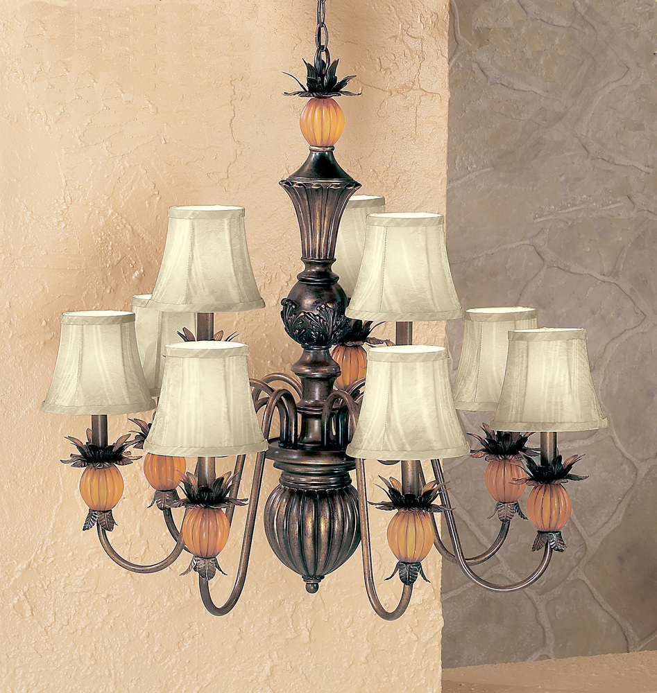 Topaz 32"Wide x 32"Long x 29"High Lights: 9 x 60W candelabra Finish Shown: Copper Bronze Crystal Shown: n/a Chain or Cable Length: 3 Ship Via: Parcel Shipping Weight: 37 Hanging Weight: 0 Catalog/Page Ref: 5005/267 Translucent topaz accents with hand-buffed patina adorn these stylish frames with robust, deeply carved columns. Frames come in a rich Copper Bronze (CPB) multi-toned finish and topped with damask silk shades.