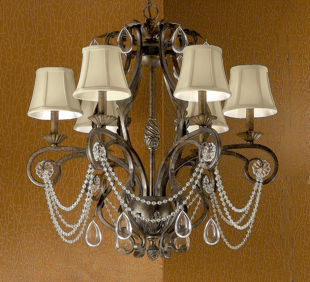 Tuscany 28"Wide x 28"Long x 29"High Lights: 6 x 60W candelabra Finish Shown: Tuscany Bronze Crystal Shown: Oysters Clear Chain or Cable Length: 3 Ship Via: Parcel Shipping Weight: 28 Hanging Weight: 25 Catalog/Page Ref: 5005/266 Wrought iron frames handsomely embellished with silk shades, crystal chains and oyster crystal in an elegant Tuscany Bronze finish (TBZ). Crystal rosettes are framed in the arms in cameo fashion to enhance the design.