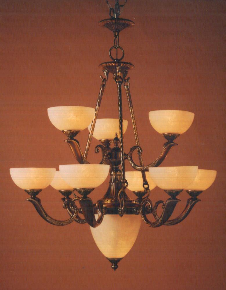 Valencia 32"Wide x 32"Long x 35"High Lights: 9 x 40W standard + 1 x 40W candelabra Finish Shown: Antique Bronze Crystal Shown: n/a Chain or Cable Length: 3 Ship Via: Parcel Shipping Weight: 52 Hanging Weight: 45 Catalog/Page Ref: 4500/151 The Valencia Series are solid brass cast fixtures made in Europe. For that subtle, elegant look that is subdued but not suppressed, these empire urn-shaped chandeliers either in single or two tire configurations offer stature to any entryway or dinning room. Finished in a muted 24k gold Matte (GM) or traditional Antique Bronze (ABZ). Fixtures in this series that have a 5 in the 3rd digit (e.g. 5652) have frosted glass shades with a hand cut pattern, those with a 6 in the 3rd digit (e.g. 5662) have genuine alabaster stone shade, that have a 7 in the 3rd digit (e.g. 562) have cream coloers glass shades painted to simulate alabaster.