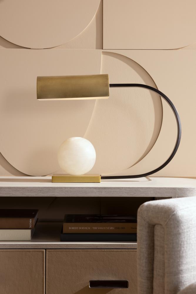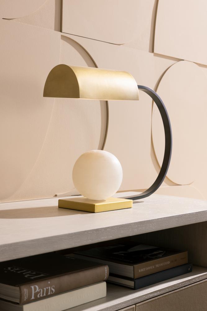 THE VENICE DESK LAMP EXUDES OPULENCE, CREATED IN EXAGGERATED FORMS AND LUXE MATERIALS. THE PHARMACY-STYLE LAMP STRIKES A SCULPTURAL PROFILE, DESIGNED WITH A SWOOPING ARM IN ENGLISH BRONZED-STEEL AND A CURVED STEEL SHADE IN A GLEAMING, ANTIQUE BRASS FINISH. A WHITE ALABASTER ORB FLOATS ATOP AN ANTIQUE BRASS STEEL BASE, COMPLETING THE DRAMATIC COMPOSITION. FINISH WILL VARY.
