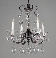 Via Lombardi 17"Wide x 17"Long x 19"High Lights: 4 x 60W candelabra Finish Shown: Ebony Pearl Crystal Shown: Crystalique Black Chain or Cable Length: 3 Ship Via: Parcel Shipping Weight: 19 Hanging Weight: 13 Catalog/Page Ref: 5207/22, 25 Deep chased Spanish solid brass castings are skillfully assembled with hand-etched 24% lead crystal columns and bobeches making magnificent chandeliers and wall scones. A careful sprinkling of light crystal trim, gives the collection a clean, subtle but elegant look.
