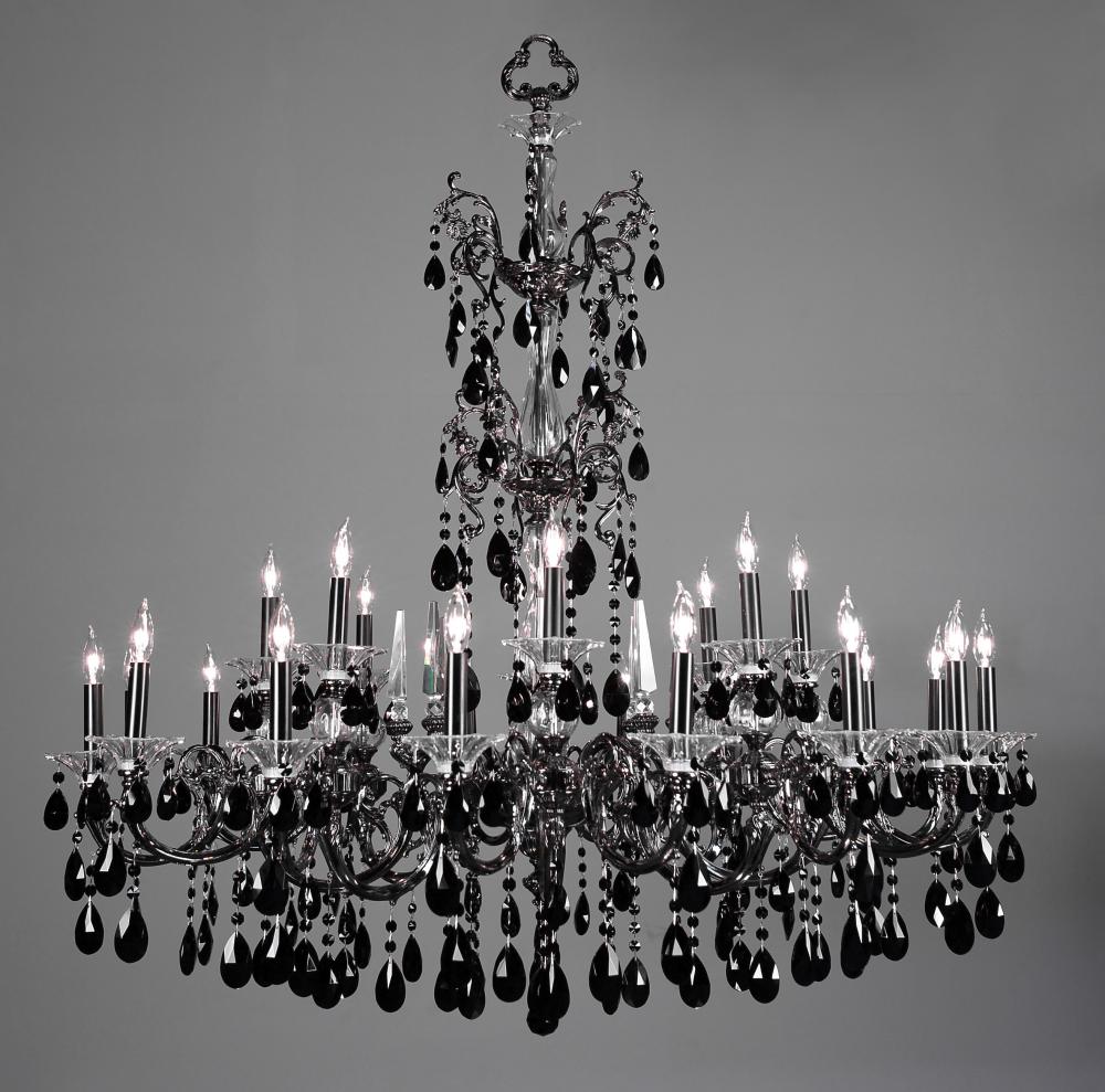 Via Lombardi 45"Wide x 45"Long x 51"High Lights: 24 x 60W candelabra Finish Shown: Ebony Pearl Crystal Shown: Crystalique Black Chain or Cable Length: 6 Ship Via: TRUCK Shipping Weight: 169 Hanging Weight: 100 Catalog/Page Ref: 5207/28 Deep chased Spanish solid brass castings are skillfully assembled with hand-etched 24% lead crystal columns and bobeches making magnificent chandeliers and wall scones. A careful sprinkling of light crystal trim, gives the collection a clean, subtle but elegant look.