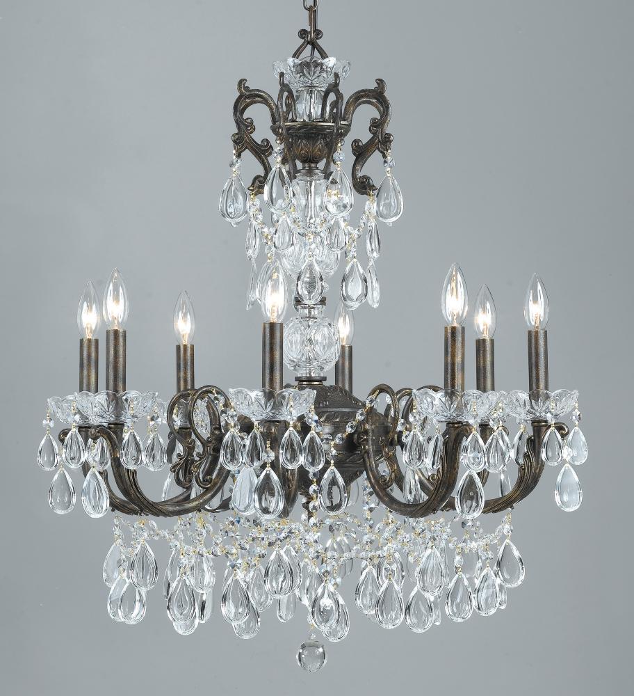 Vienna Palace 27"Wide x 27"Long x 31"High Lights: 8 x 60W candelabra Finish Shown: English Bronze w/Gold Crystal Shown: n/a Chain or Cable Length: 3 Ship Via: Parcel Shipping Weight: 39 Hanging Weight: 40 Catalog/Page Ref: 5410/42 The Vienna Palace series is modeled after the elegant crystal chandeliers found in the Palaces and Ballrooms of Vienna Austria. The crystal drops will not create colors as they are not highly faceted and do not create a prismatic effect. This reflects the early uses of crystal on chandeliers before the time when they had the technology to cut and polish the crystal. These are "instant antiques." The English Bronze with Gold patina is a painted finish that replicates an aged bonze fixture. The Renovation Brass finish is a plated and antiqued finish mimicking a brass finish that has aged over the years.