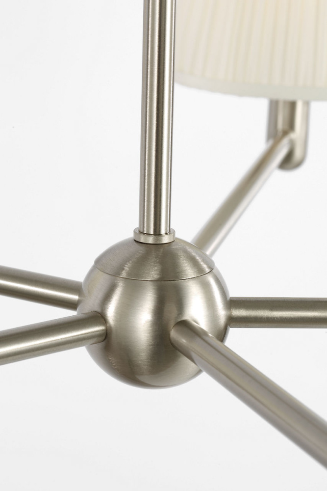 The Vilera 5-Light Chandelier features five white fabric shades set around a slender radial frame. Each shade diffuses light evenly, softening the geometric arms and creating a comfortable glow. Scaled for dining rooms, living areas, or bedrooms, this chandelier brings a balanced presence with a relaxed texture.