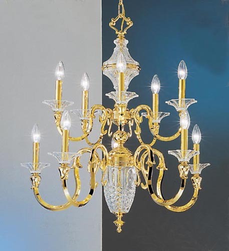 Weatherford Gold 30"Wide x 30"Long x 31"High Lights: 10 x 40W candelabra Finish Shown: 24k Gold Plate Crystal Shown: n/a Chain or Cable Length: 3 Ship Via: Parcel Shipping Weight: 31 Hanging Weight: 25 Catalog/Page Ref: 5005/208 These European made, solid Brass frames are polished to a high luster, then plated with 24k gold and adorned with 24 percent lead crystal column parts and bobeches, will fit any high end traditional décor.
