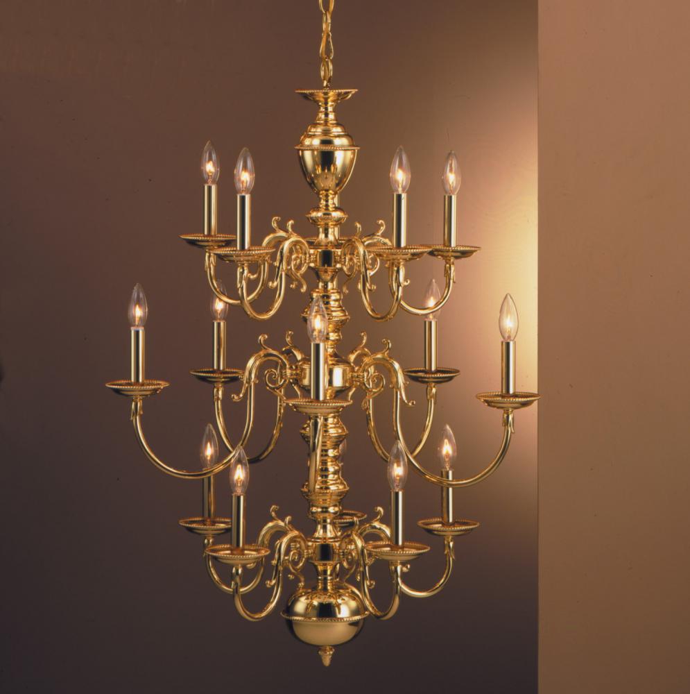 Williamsburg 29"Wide x 29"Long x 39"High Lights: 15 x 60W candelabra Finish Shown: 24k Gold Plate Crystal Shown: n/a Chain or Cable Length: 3 Ship Via: TRUCK Shipping Weight: 30 Hanging Weight: 25 Catalog/Page Ref: Website Traditional Williamsburg style chandelier.