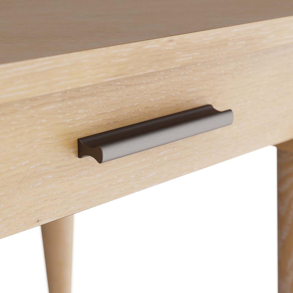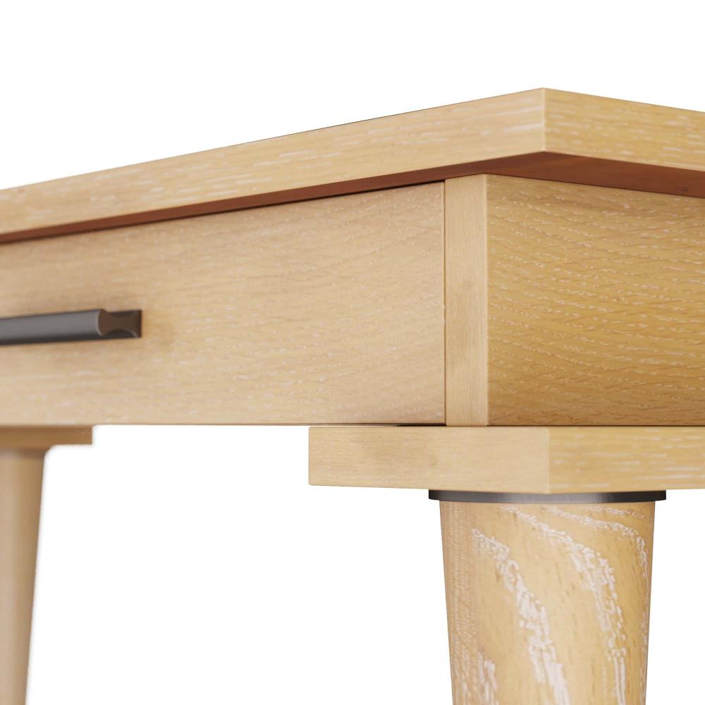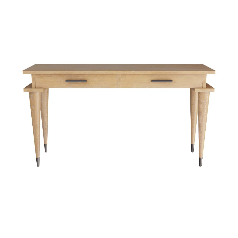 OUR MASTERFULLY CRAFTED WRIGHTMAN DESK SHOWCASES THE BEAUTY OF OYSTER OAK VENEER. BEARING STRIKING LINES, THE WRITING DESK IS DESIGNED WITH A FLOATING, RECESSED DRAWER CASE, WITH TWO PENCIL DRAWERS THAT ARE FINISHED WITH STREAMLINED, LINEAR BRONZE BRASS HARDWARE. THE DESKTOP FEATURES A RADIAL STARBURST PATTERN. SEVERELY TAPERED LEGS WITH BRONZE BRASS SABOTS COMPLETE THE PIECE. FINISH WILL VARY.