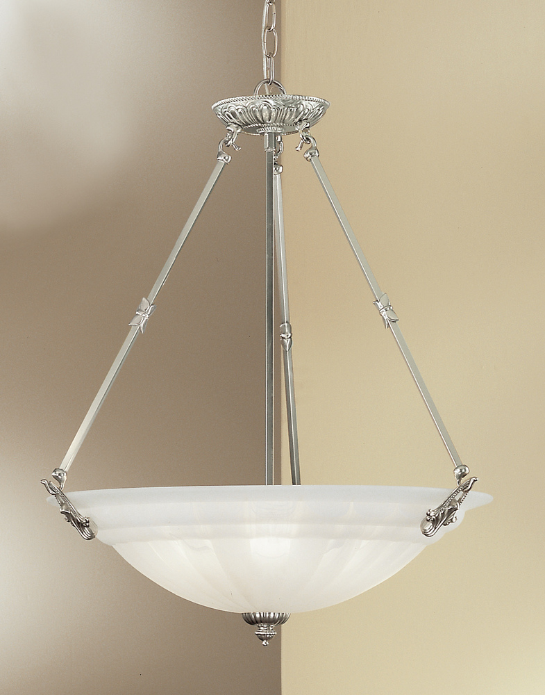 Yorkshire II 26"Wide x 26"Long x 27"High Lights: 6 x 60W standard Finish Shown: Satin Nickel Crystal Shown: n/a Chain or Cable Length: 3 Ship Via: Parcel Shipping Weight: 25 Hanging Weight: 21 Catalog/Page Ref: 5005/234 Sometimes less is more. These contemporary-looking solid brass frames finished in a soft satin nickel finish complement the detailed veining of the alabaster glass center-bowls and shades. To fill all lighting needs in one’s home, this series offers a complete line of lighting coordinates - from the large foyer and dining room chandeliers to the hall and vanity bath bars